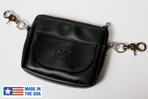 Hipster Bag with adjustable strap for conversion to a fashionable cross-shoulder bag. Three-pocket, multiple zippered storage areas with Black Icon embroidered on front pocket with magnetic closure. Weather-resistant and lined.